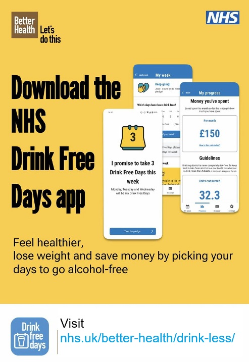 Download the NHS Drink Free Days app Posted on: 11th December 202511th December 2025 Thinking about drinking less? Download the ‘Drink Free Days’ app on your smartphone. NHS Drink-less